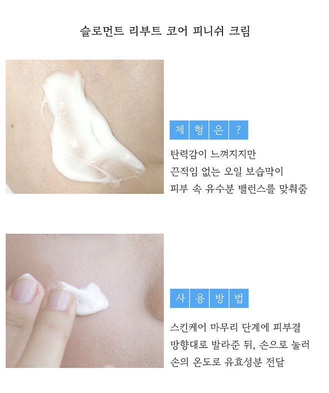 또한, 속 건조를 해결해 주기 때문에 번들거리는 유분감도 잡고 은은한 물광 피부를 연출할 수 있었어. 번들거림 때문에 화장이 잘 밀착되지 않거나 지성 피부 타입도 함께 사용할 수 있는 제품을 찾는다면 슬로먼트 리부트 코어피니쉬 크림을 추천!
