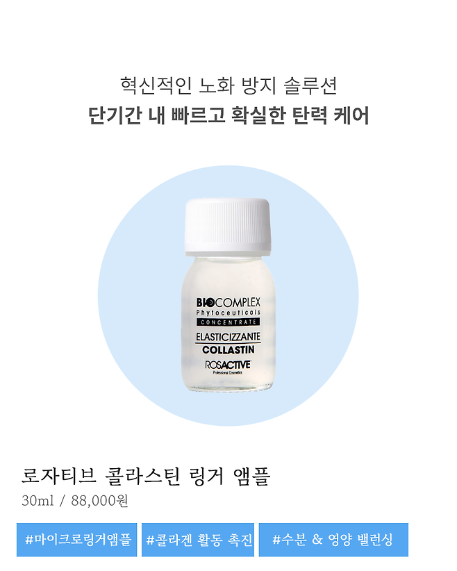 로자티브 마이크로 콜라스틴 링거앰플은 콜라겐과 엘라스틴 활동을 촉진하여 콜라겐 양을 증가시키고 피부에 퍼밍 효과를 선사하여 수분과 영양 밸런싱을 유지시켜 탄력과 탄탄함을 채워줘!