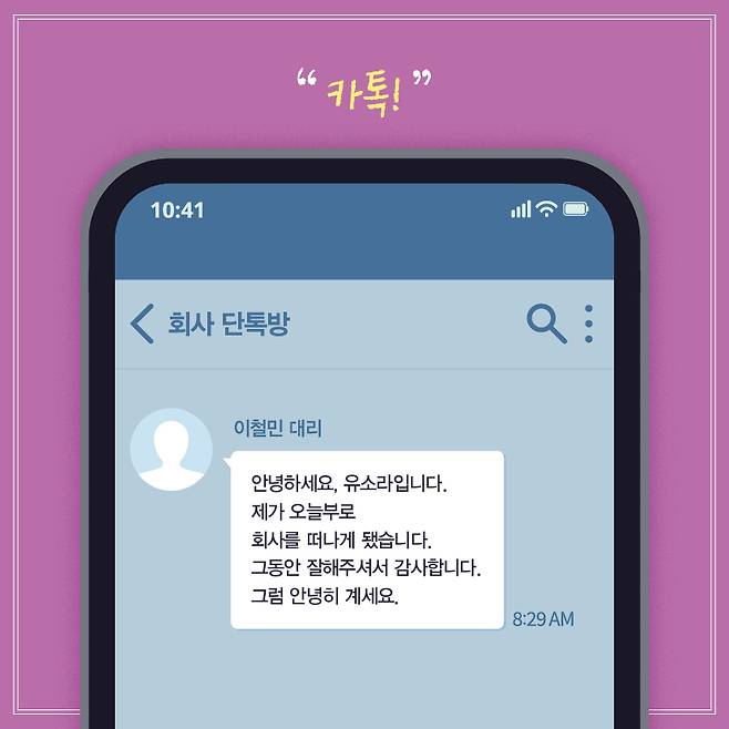 나는 소스라치게 놀랐다. 유소라 팀장은 이미 퇴사한 사람이었기 때문이다. 퇴사 인사를 전한 주인공은 유소라가 아닌 마지막 연차를 쓰고 자리에 없는 이철민 대리였다.