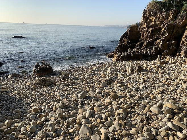 한섬 감성바닷길을 걷다 보면 파도에 닳아 납작해진 하얀 돌과 몽돌 해변이 이어지는 구간을 만납니다. 이 구간에는 방문객들이 쌓아 올린 작은 돌탑들이 곳곳에 남아 있어, 바다 풍경에 소소한 이야기를 더합니다.