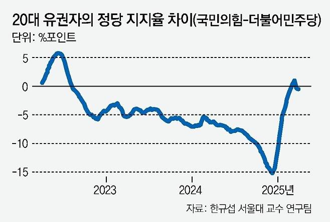 - 윤석열 비상계엄 직후에는 민주당과 국민의힘의 지지율 15.1%포인트까지 벌어졌다가 올해 1월 들어 바닥을 쳤다. 3월 들어 국민의힘이 잠깐 역전하기도 했지만 다시 꺾인 상태다.