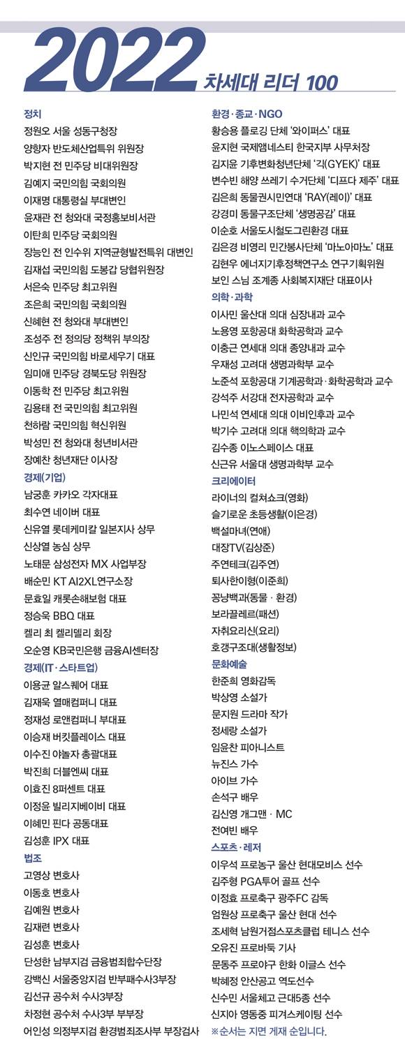 시사저널의 창간 기획 '차세대 리더 100'은 국내 언론 사상 최장기 기획인 '누가 한국을 움직이는가'의 미래 버전이다. 창간 33주년을 맞아 시사저널이 내놓는 '2022 차세대 리더 100'의 선정 과정은 예년과 크게 다르지 않다. 정치, 경제(기업·IT·스타트업), 사회(법조·환경·NGO·종교·의학·과학·크리에이터), 문화(예술·영화·방송연예·스포츠·레저) 각 분야에서 내일의 대한민국에 큰 영향력을 행사할 것으로 기대되는 인물 100명을 추렸다. 여론조사 전문기관 '칸타퍼블릭'에 의뢰해 전문가 500명, 일반 국민 500명 등 총 1000명을 대상으로 설문조사를 진행했고, 이를 기초자료로 해서 시사저널 기자들이 각 분야 전문가들의 자문을 받아 후보군을 압축했다. 최종적으로 시사저널 편집국에서 올 한 해 미디어에 나온 여러 자료를 검토하고 검증하는 과정을 거쳤다. 국내외적으로 그 어느 때보다 미래의 불확실성과 함께 위기감이 커지는 2022년 말. 시사저널이 제시하는 100명의 차세대 리더를 보면서, 그래도 내일을 기대해볼 수 있는 시간을 갖기를 소망해 본다.