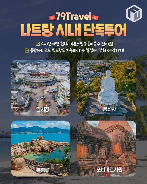 79트래블을 이용하면 단독 나트랑 시내투어도 가능합니다. 담시장, 통선사, 포나가르사원, 혼총곶 등 나트랑 시내의 주요 여행지는 대부분 밀집해있어 그랩을 이용하거나, 별도 당일 투어 상품을 이용하게 되는데요.