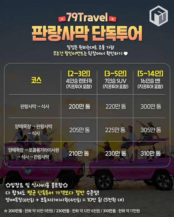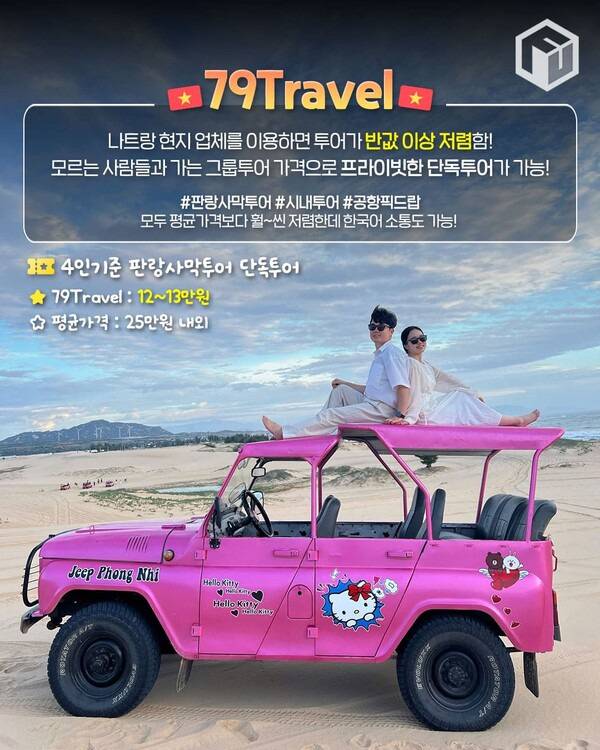국내 여행 플랫폼에서 일반적으로 판매하는 나트랑 판랑사막 단독 투어 상품은 그룹투어가 많습니다. 때문에 다른 사람들과 일정과 차량을 공유해야 하는데요. 현지 전문 업체인 '79 트래블'을 이용한다면 그룹투어와 같은 가격대로 프라이빗한 단독 투어를 즐길 수 있습니다.