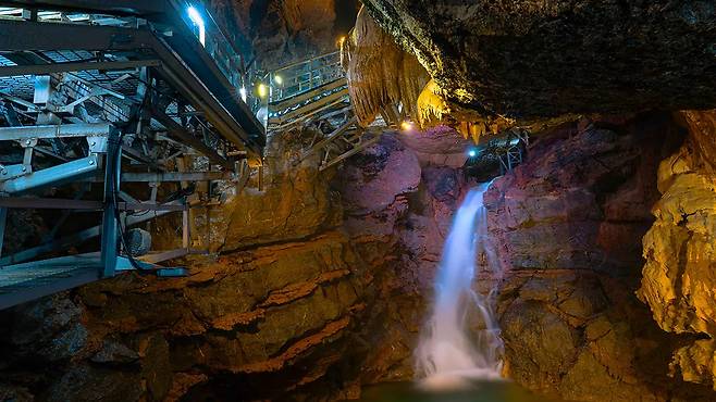 모노레일에서 내려 본격적으로 발을 들여놓는 순간, 대금굴의 심장부는 거대한 물의 세계임을 알 수 있다. 끊임없이 울려 퍼지는 물소리가 탐험객을 감싸며, 그 끝에는 높이 약 8m에 달하는 국내 최대 동굴 폭포가 장관을 이룬다. 수억 년의 침묵을 깨고 흘러내리는 물줄기는 압도적인 생명력을 뿜어내며, 보는 이들의 숨을 멎게 만든다.