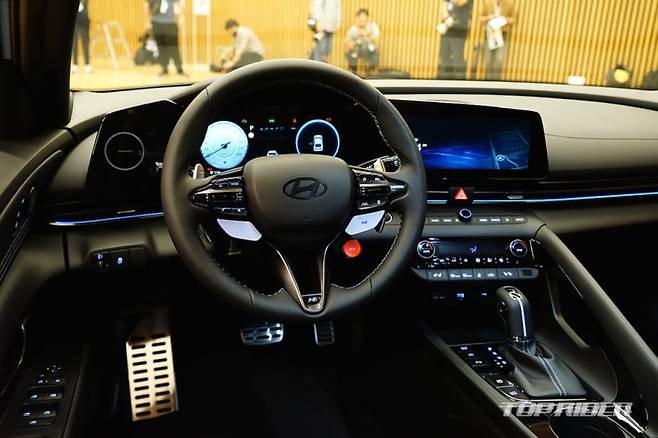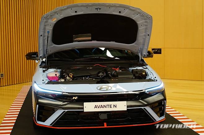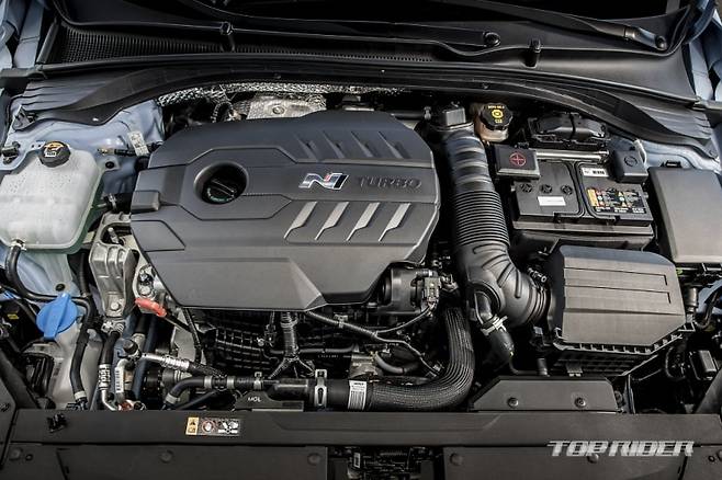 현행 아반떼(CN7) N에는 N 전용 가솔린 2.0 터보 플랫파워 엔진이 적용돼 최고출력 280마력(5500-6000rpm), 최대토크 40.0kg(2100-4700rpm), 공차중량 1520kg(8 DCT), 100km/h 정지가속 5.3초, 최고속도 250km/h다. 터빈을 키우고, 실린더 블록 형상, 재질 개선으로 내구성을 높였다.