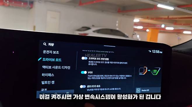 가상변속시스템은 사용자가 직접 설정 메뉴에서 활성화해야 하는데, 차량 설정 > 액티브 사운드 디자인 메뉴에서 드라이브 모드를 선택한 뒤 VGS 버튼을 켜면 사용할 수 있다.