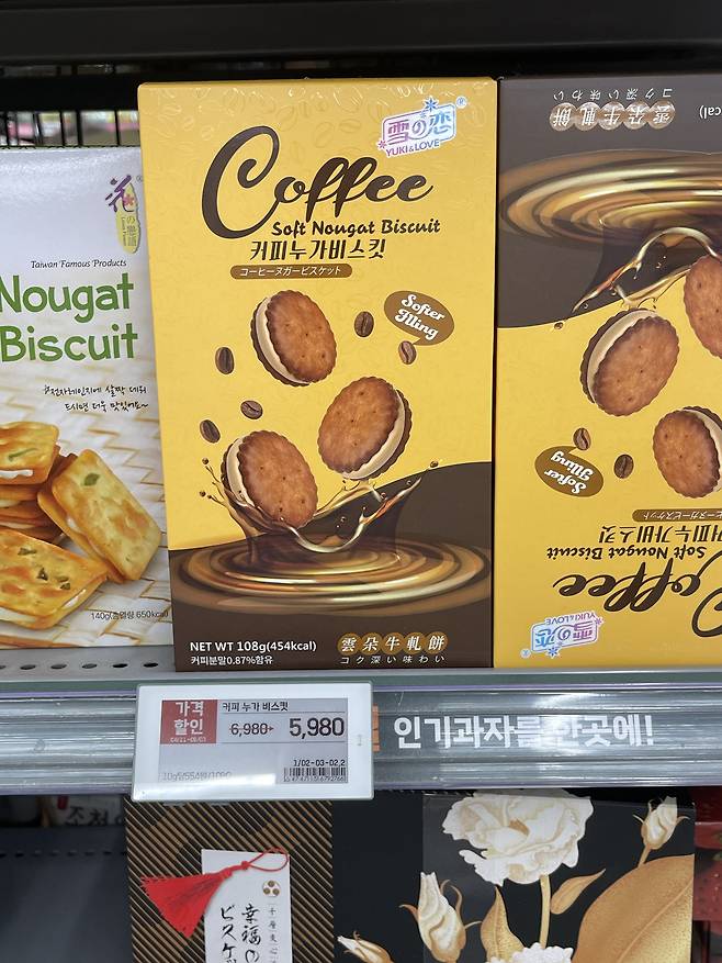커피 누가비스킷은 바삭한 크래커 사이에 커피 풍미를 더한 쫀득한 누가 크림을 넣은 과자예요.