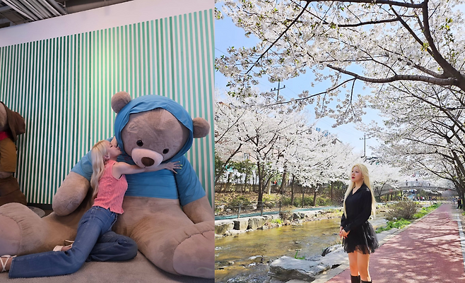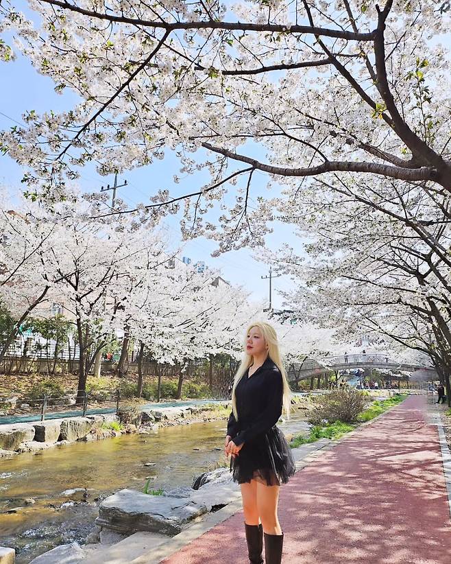 만개한 벚꽃을 배경으로 한 바다의 올블랙 코디네이션이 눈길을 끈다. 블랙 재킷에 프릴 디테일이 가미된 스커트를 매치해 봄의 로맨틱한 분위기와 절묘한 조화를 이루고 있다. 무릎까지 오는 부츠로 다소 쿨한 느낌을 더했으며, 자연스럽게 흘러내린 금발이 전체적인 룩의 완성도를 높이고 있다.