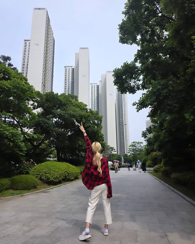 레드 체크 셔츠와 화이트 와이드 팬츠의 조합으로 깔끔한 캠퍼스 룩을 선보이고 있다. 뒤돌아 손을 흔드는 역동적인 포즈가 자유분방한 매력을 강조하며, 화이트 스니커즈로 통일감을 줬다. 고층 아파트를 배경으로 한 도시적 풍경과 어우러져 현대적인 감각을 드러내고 있다.