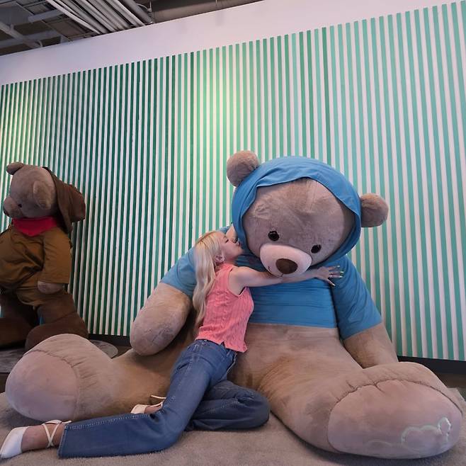 핑크 톱과 데님 팬츠를 조합한 캐주얼한 스타일링으로 친근하고 발랄한 매력을 드러내고 있다. 대형 테디베어 앞에서의 자연스러운 포즈가 장난기 넘치는 분위기를 연출하며, 화이트 스니커즈로 편안함을 더했다. 핑크와 데님의 조합이 젊고 활기찬 에너지를 표현하고 있다.