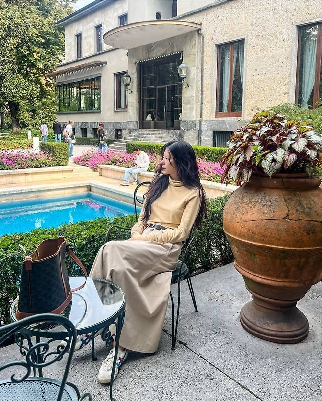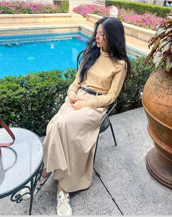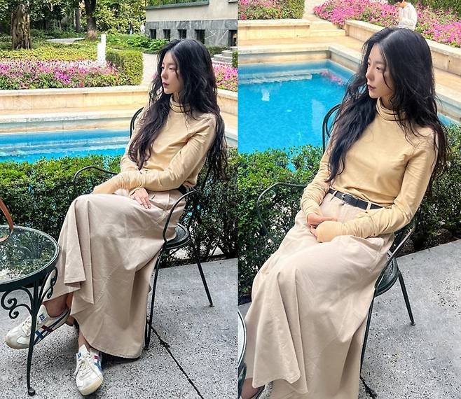 장재인은 따뜻한 햇살 아래 여유롭게 앉아, 고급스럽고 우아한 무드를 연출하며 가을 분위기를 물씬 풍겼습니다.