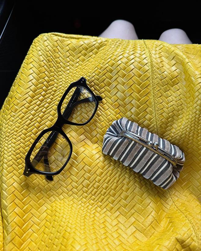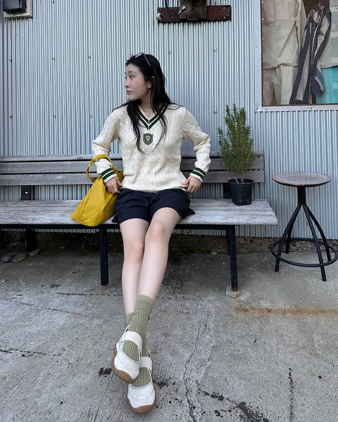 니트 중앙의 엠블럼 패치 디테일은 룩에 포인트가 되어주며, 블랙 뿔테 안경과 노란 니트백까지 더해져 캐주얼한 감성이 배가되었어요.