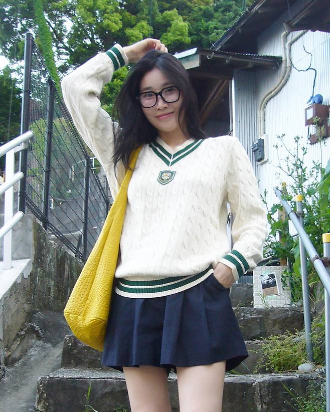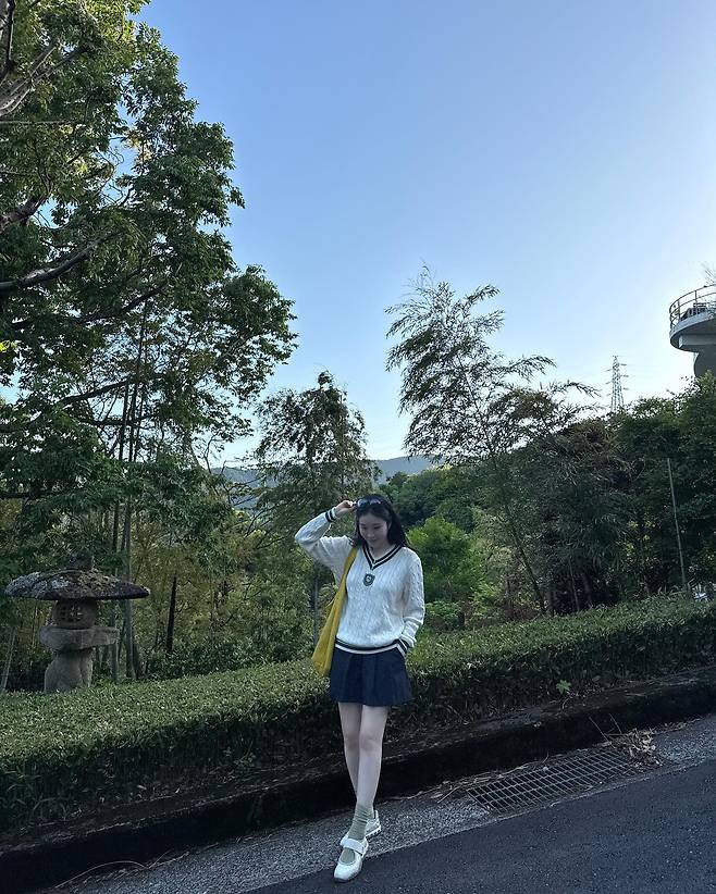 목선을 따라 떨어지는 초록 배색 라인이 클래식한 스쿨룩 분위기를 더해주고, 깔끔한 메이크업 없이도 전체적으로 밝고 건강한 인상을 주고 있죠.
