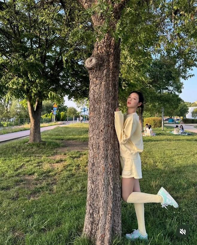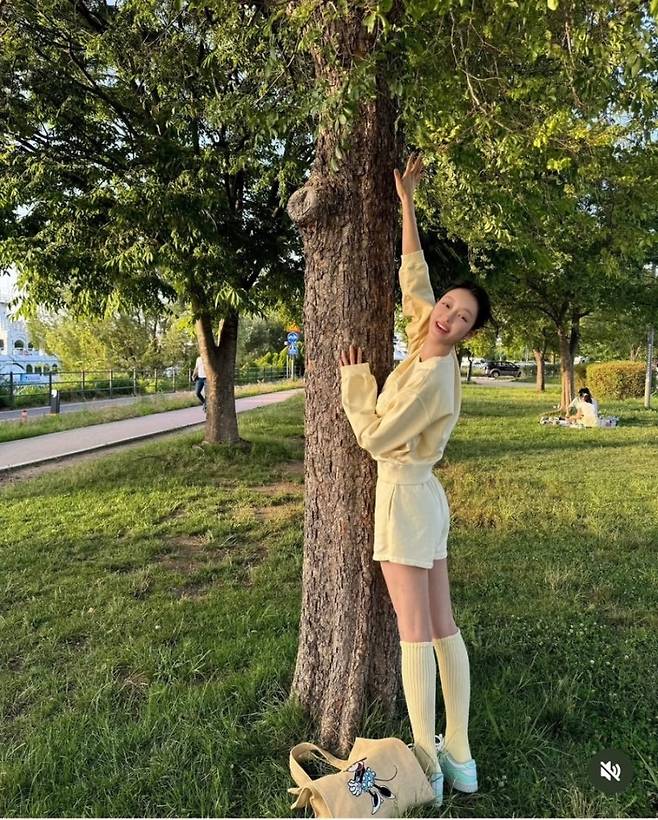 무릎까지 올라오는 니삭스는 다리가 짧아 보일 수 있다는 단점이 있지만, 유아는 자신만의 스타일로 완벽하게 소화했습니다. 연노랑 셋업 츄리닝과 니삭스를 매치하고, 같은 컬러의 가방과 민트색 운동화로 포인트를 주어 상큼한 피크닉 룩을 완성했네요. 과감한 니삭스 스타일링도 유아만의 매력으로 승화시키는 센스!