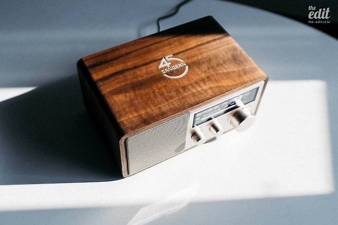 디자인부터 보자. 전면은 샴페인 골드 색상의 알루미늄 패널로 되어 있고 왼쪽은 스피커, 오른쪽에는 현재 주파수를 표시하는 창이 있다. 아래에 있는 커다란 주파수 다이얼을 이리저리 돌리면 현재 주파수 대역에 맞는 라디오 방송이 나온다.