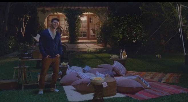 영화 Home Again의 한 장면. 마당에 쿠션을 깔고 음식을 나누어 먹을 준비를 하는 장면. 많은 쿠션이 보기만 해도 포근하다.