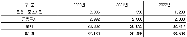 업권별로 보험이 3만2천417건으로 가장 많았다. 전년 대비 22.0% 급증한 것이다.