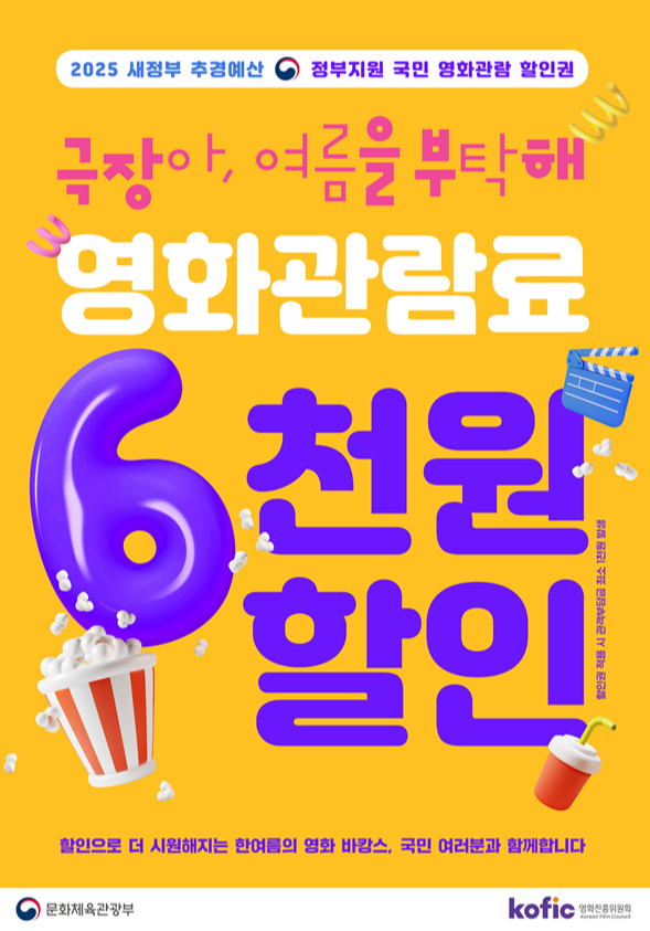 문화체육관광부가 영화진흥위원회와 함께 영화관 입장권 6000원 할인권을 총 450만 장 배포합니다. 이번 사업은 새 정부의 2025년 2회 추가경정예산 271억 원을 통해 추진하는 것으로 내수 진작을 통한 민생 회복과 영화산업 활성화를 위해 마련됐습니다.