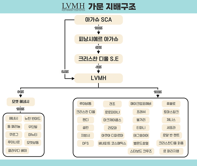 ‘아가슈 SCA’가 최대주주인 또 다른 상위 계열사 ‘피낭시에르 아가슈(Financière Agache)’는 크리스챤 디올 SE의 지분 97%를 소유한 동시에 아르노 가문의 자산을 관리하는 투자사 역할을 도맡고 있다. ‘크리스챤 디올 S.E.’는 LVMH 모엣 헤네시 루이 비통(LVMH SE)에 대한 지분 41%를 소유하고 있으며 LVMH는 루이비통, 디올, 셀린느, 펜디, 불가리, 티파니앤코 등 세계적으로 유명한 명품 브랜드 기업의 최대주주에 올라 있다.
