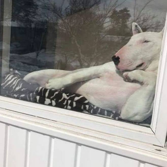 창문 밖에서 집 안을 들여다보니, 웬걸, 우리 댕댕이가 창가에 기대어 우아하게 누워있지 않은가. 한 손은 턱에 괴고, 다른 한 손은 배에 얹은 채, 마치 왕국의 왕처럼 여유로운 자세였다.