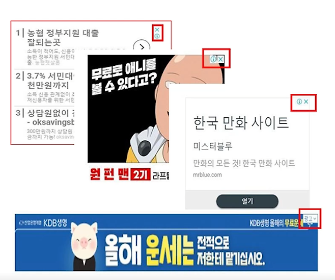 다들, 이런 광고 보신 적 있으신가요? 파란색 X표와 느낌표가 붙어있는 광고들. 저희가 평소에 검색을 하면 엄청 귀찮게 따라붙는 광고들인데요. 이것들을 구글 애드센스 광고라고 불러요. 이제 우리는 이 광고와 친해지셔야 합니다. 이것들을 우리에게 돈을 가져다줄 테니까요!