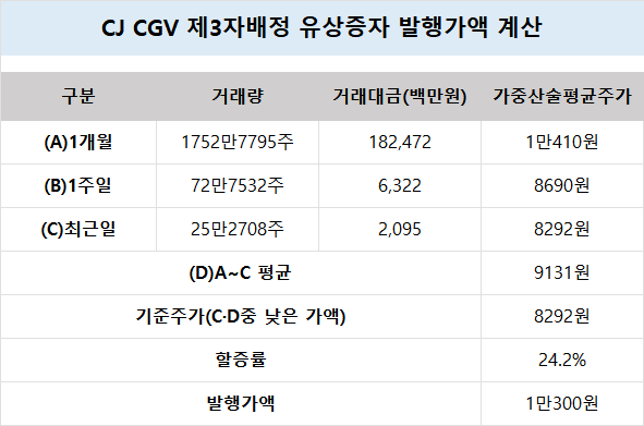 CJ CGV 신주 발행가, 24.3% 할증 붙었다