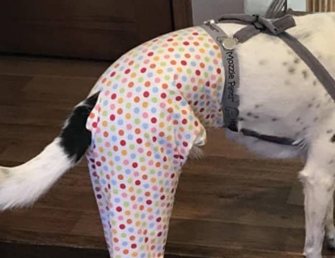 고개된 사진 속에는 툭하면 넥카라를 거부한 탓에 고민한 집사가 평소 잘 입지 않은 바지에 멜빵을 채워 강아지에게 입혀준 모습이 담겨 있었죠.