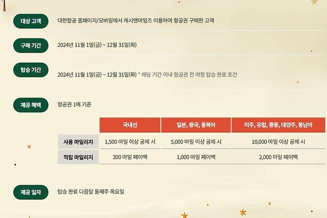 대한항공은 12월 31일까지 '캐시 앤 마일즈'를 이용해 항공권을 구매한 고객에게 마일리지를 환급하는 페이백 이벤트를 실시한다.