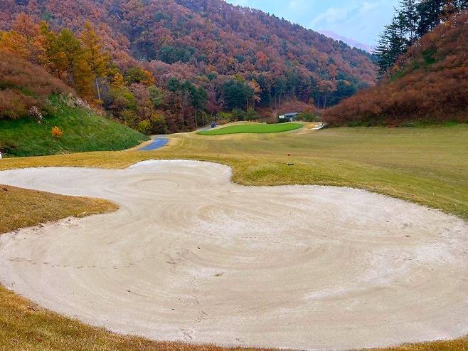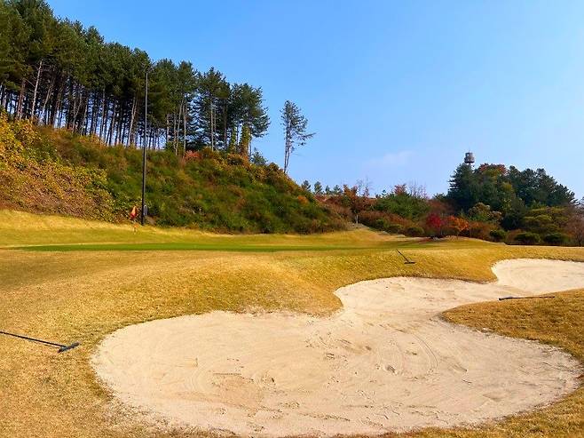페어웨이 벙커는 티샷 시 에이밍에 도움이 되는 편이고 사이드에 있다 보니 벙커 플레이를 안 할 가능성이 높습니다. 그린사이드 벙커 또한 그린과 거리가 있다 보니 심리적으로 부담이 있는 편이 아닙니다. 페어웨이 벙커나 그린 사이드 벙커 모두 일률적이진 않지만 턱이 낮은 편이여서 평균 이하의 난이도라 생각하시면 좋을 것 같습니다.