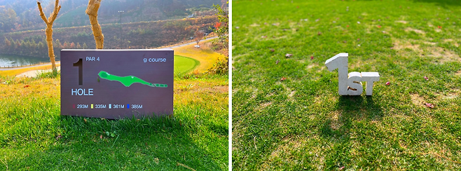 베뉴지cc는 리셉션과 라커룸이 같은 층에 있고, 대식당과 스타트 지점은 한층 내려가면 나옵니다. 코스 내에 별도의 코스맵이 그려진 안내판이 설치되어 있습니다. 티잉그라운드의 티 블럭은 매홀마다 몇 번째 홀인지 알아볼 수 있는 블럭을 사용 중인데 참 괜찮은 아이디어란 생각이 들었습니다.
