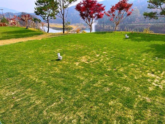 베뉴지cc의 페어웨이는 조선 잔디를 사용하고 있고 잔디 길이는 여느 골프장과 비슷한 짧은 길이로 관리되고 있었습니다. 보통 페어웨이 잔디는 20mm 정도로 관리하는데 베뉴지cc 또한 20mm 정도의 길이로 관리되고 있었습니다. 이제 골프의 계절이 끝나가는 건지 잔디의 색깔이 많이 죽었고 디봇 자국에서 더 이상 잔디가 생육이 되지 않아 디봇 자국이 많이 보이는 편입니다.