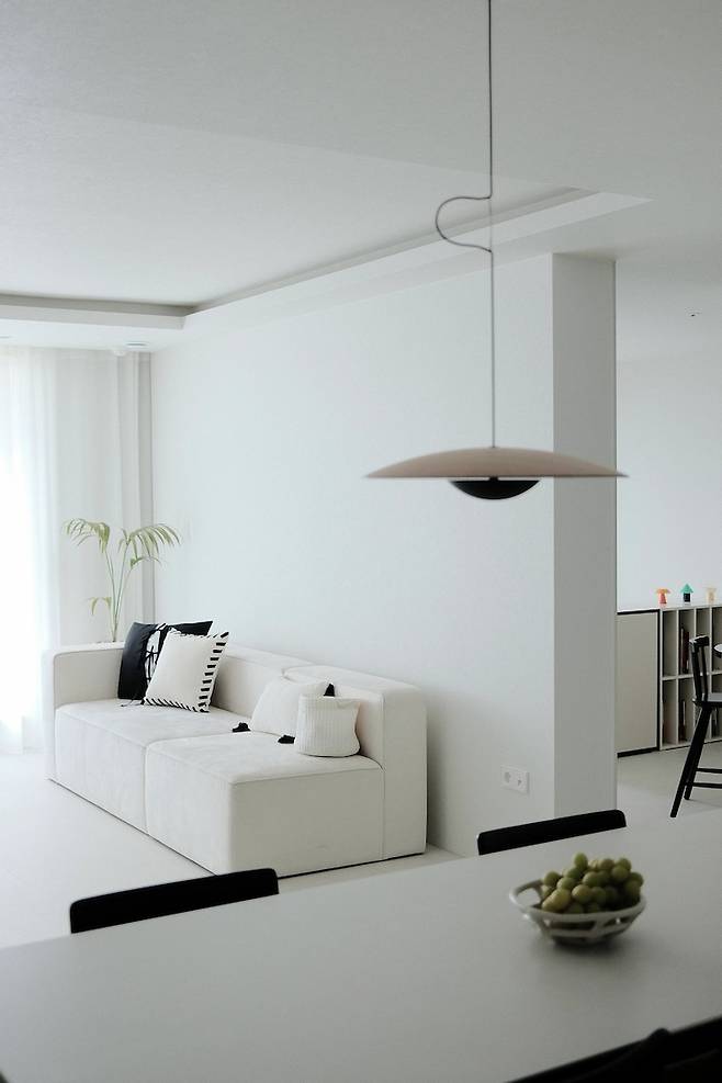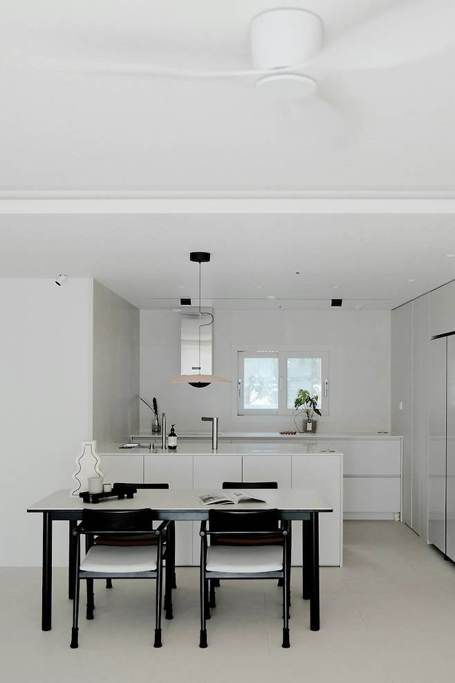 거실을 마주하고 있는 주방! 주부의 로망이 실현되는 곳인 주방은 과감하게 상부장 없이 진행하기로 했어요. 왼편의 벽이 알파룸이자 방인데, 다이닝 부분을 조금 더 넓게 사용하고 싶어서 맞은편 방과 벽선을 맞춰서 가벽을 새로 세웠답니다.