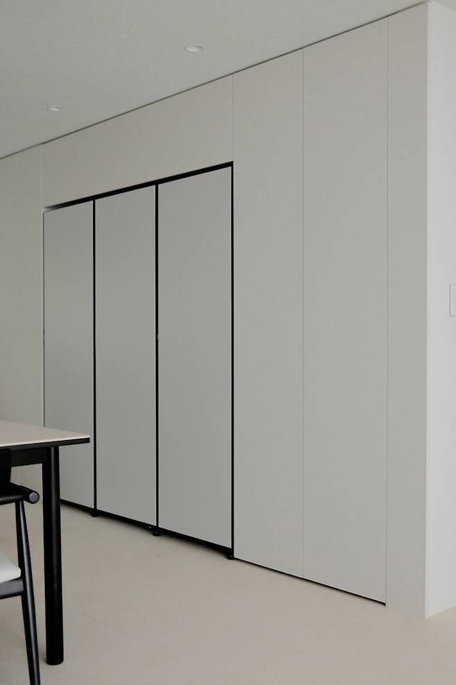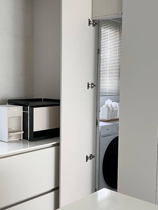 세탁실로 나가는 문은 페이크 도어로 벽면처럼 보이도록 인테리어 실장님이 제안해 주셨어요. 문을 2개 여닫음이 불편할까 싶어서 안 했던 부분인데, 막상 해 놓으니 너무 만족스럽고 생각보다 불편하지 않더라구요! 세탁실이 길어서 세탁기와 건조기를 병렬구조로 배치하였는데 세탁실 정리가 된다면 다음에 한번 소개해드릴게요!