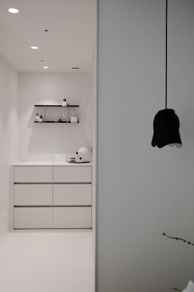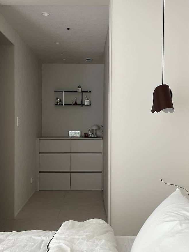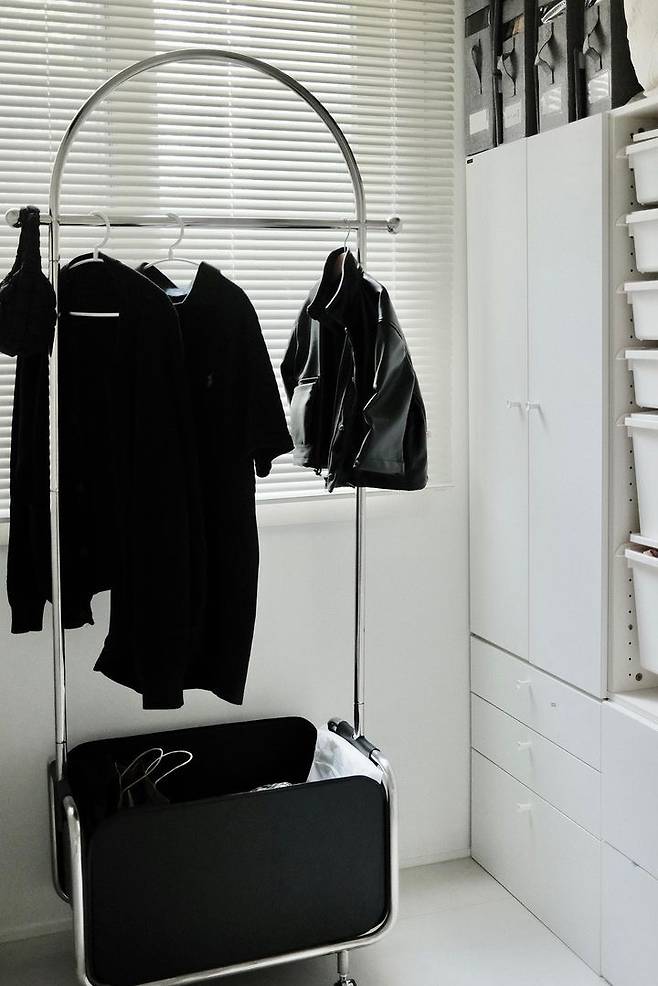 옷장과 서랍장을 배치하고 남은 공간은 옷봉을 달아 간단한 샤워가운이나 가방을 걸어두는 공간으로 사용해요.