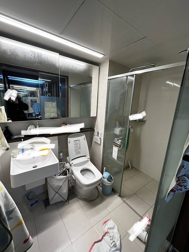 이곳은 안방에 위치한 욕실입니다. 일반 욕실과 다르게 유리 벽면과 세면대, 변기 위치가 달랐어요.