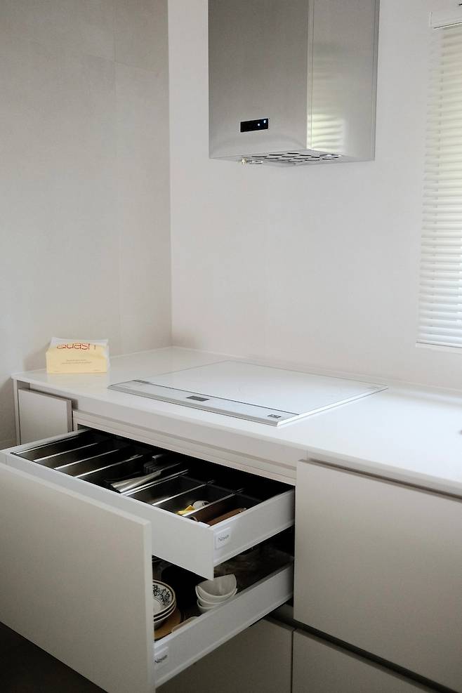 인덕션 밑엔 수저함을 그리고 그 밑엔 그릇을 두었어요 . 제일 밑에 서랍장엔 냄비나 후라이팬을 배치했고, 저만의 주방동선을 고려하여 각 위치를 선정하였어요.