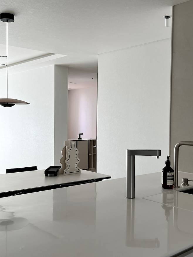 주방의 가로폭이 생각보다 넓은 편이 아니라 상부장을 없애고, 광폭 아일랜드로 수납력을 부족하지 않도록 하였어요. 상부장은 잘 사용하지도 않았지만 답답한 느낌이 싫어서 없앴는데 너무 만족해요.