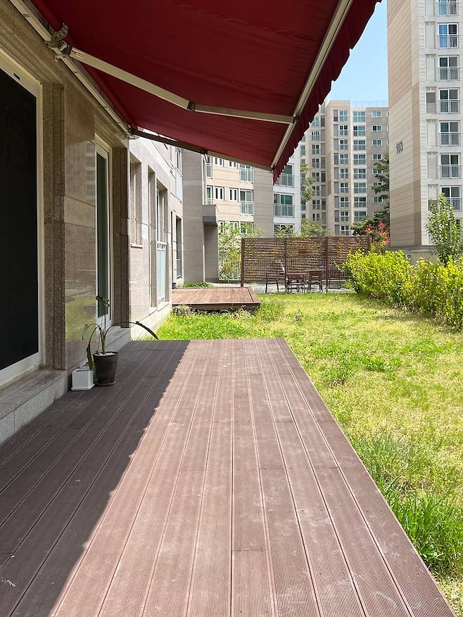 테라스가 있는 집 위엔 어닝도 달려있어 햇빛이 강할 땐 어닝을 펴주기도 해요.