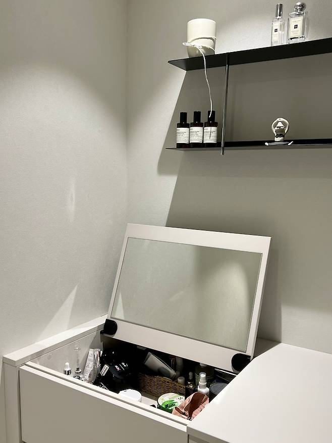 화장을 서서 하는 편이고 화장대에 화장품들이 올라가 있는 모습과 먼지가 쌓이는 모습이 싫어서 저는 화장대를 숨겼는데요. '다들 화장대는 왜 없어?'라고 하지만 숨겨진 공간에 있답니다.