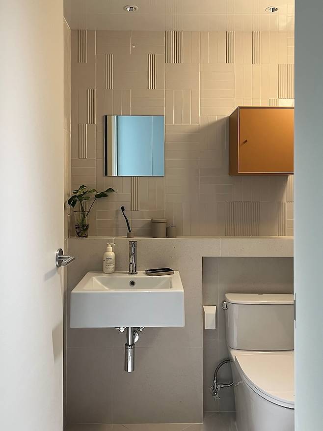 욕실은 오로지 대표님 감각에 믿고 맡겼어요:) 귀엽기도 하고 코지하기도 하고 매력이 뚝뚝 떨어지는 저희 부부만의 욕실 공간이랍니다. 타일이 포인트랍니다.