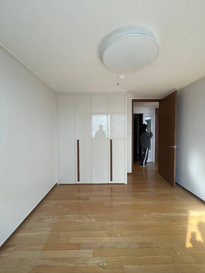 저희 집은 문 앞에 공용 엘레베이터가 있는 구조이고 아이들 방문이 다 보이는 구조였어요. 방 한쪽 벽은 가벽으로 이루어져 있었기 때문에 방문 위치를 바꿀 수가 있었어요.