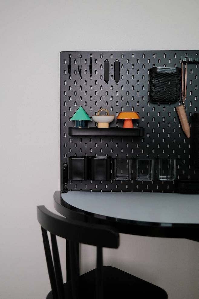 책상에 고정시켜 둔 이케아 페그보드는 너무 활용도가 좋아서 200% 만족하고 있어요. 벽에 고정하는 용, 책상에 고정하는 용이 있는데, 벽을 건드리고 싶지 않아 책상에 고정하는 피스(하얀색 뿐)를 추가 구매하여 블랙으로 칠해주었답니다.