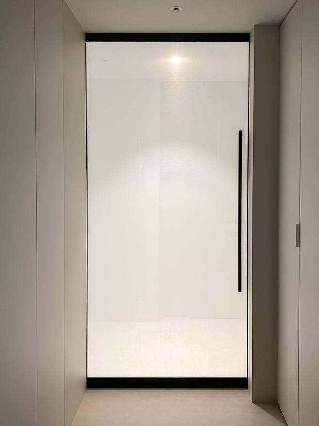 중문을 선택할 땐 '프라이버시도 지켜지고, 중문 자체가 고급스러움이 느껴지면 좋겠다!'라고 생각하고 찾았어요. 패브릭이 접합 된 유리로 중문에 넣어 중문시공을 하는 곳을 알게 되었고, 집의 첫 인상이 중요하기에 패브릭 유리 중문으로 시공하게 됐습니다.