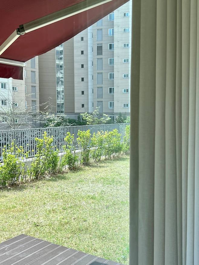 저희 집은 기본개념의 1층도 아니고 필로티 2층도 아닌 밑엔 아파트 커뮤니티가 있어서 3층 같은 1층이예요. 또한 테라스도 존재하죠. 고도 제한 아파트인지라 아파트 높이가 낮은편에 속해서 앞 동 아파트 높이가 높지 않아요. 덕분에 햇빛도 잘 들어오고 앞에 테라스가 있어 샷시창에 난간이 없답니다. 시야에 가리는 것도 없어서 너무 만족스럽더라구요.