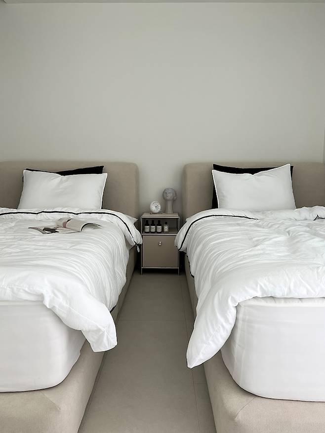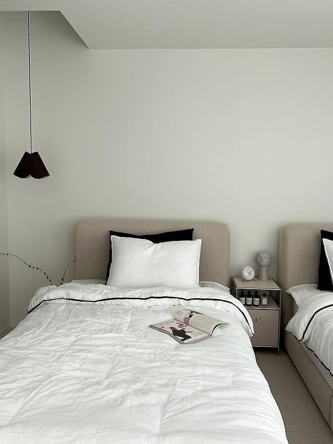 이사하는 김에 트윈 침대로 수면의 질을 높여보자는 생각에 슈퍼 싱글 2개로 배치하였는데 진짜 호텔 같고 잘때 만큼은 저만의 공간에서 휴식하는 기분이라 삶의 질도 상승하는 기분이에요.