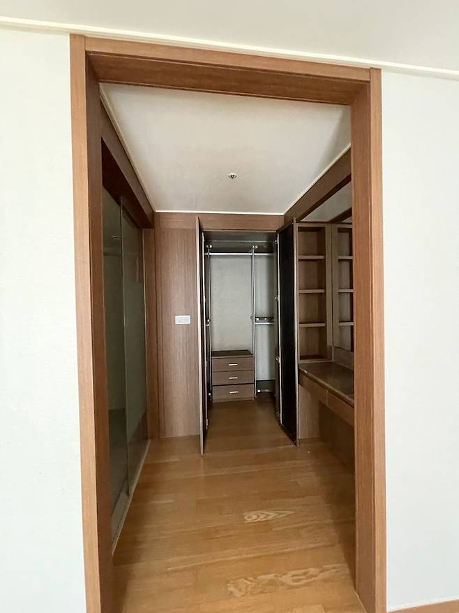 과거 안방 드레스룸은 욕실이 유리 벽면으로 이루어져 있었고 화장대, 미니 옷장이 있었어요. 안방 드레스룸이 협소하였기때문에 방 4개중 알파룸에 드레스룸으로 꾸며 놓았어요.