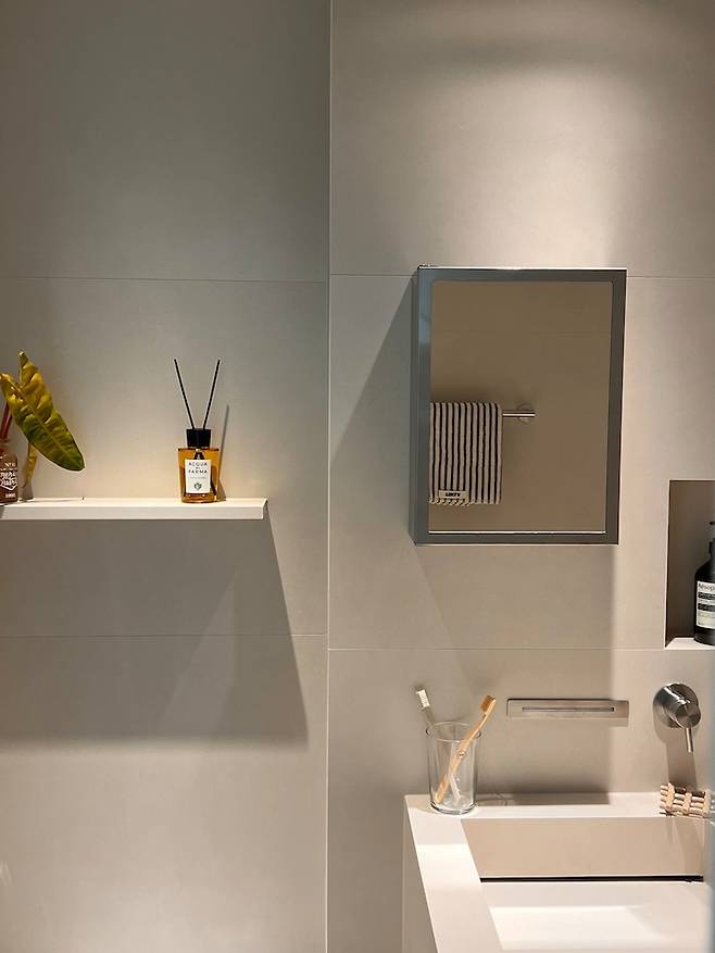 건식은 아니지만 건식에 가깝게 사용하려고 깔끔한 호텔 느낌의 욕실을 만들어보고 싶었습니다.
