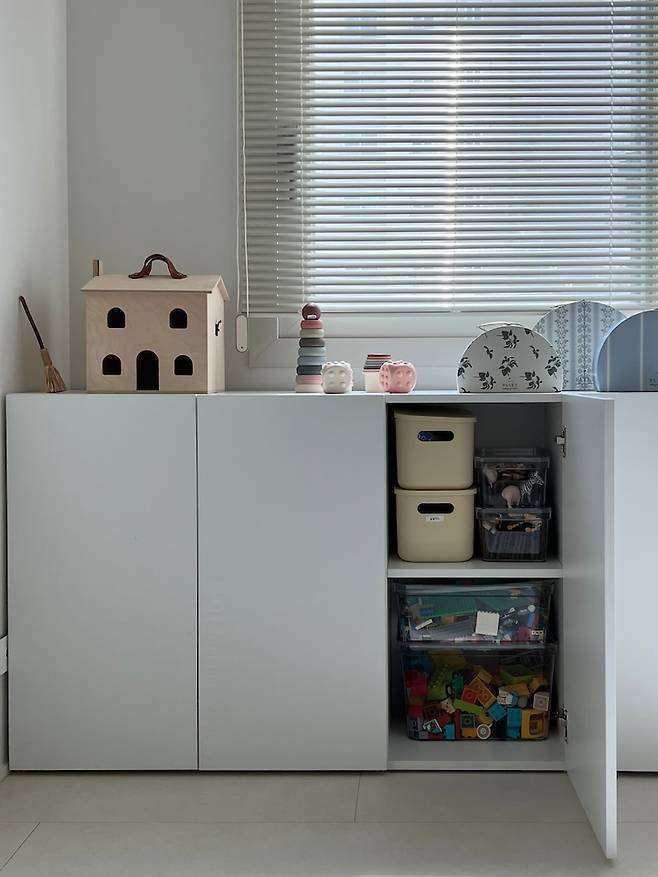 붙박이장 있던 곳은 이케아 장난감 정리 수납함이자 책상인 스모스타드를 배치하였고, 추후 장난감이 줄어들 시기엔 책상으로도 이용할 수 있다는 장점이 있어 구매하였습니다.