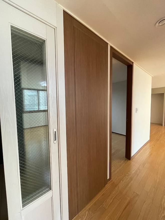 저희 집은 문 앞에 공용 엘레베이터가 있는 구조이고 아이들 방문이 다 보이는 구조였어요. 방 한쪽 벽은 가벽으로 이루어져 있었기 때문에 방문 위치를 바꿀 수가 있었어요.